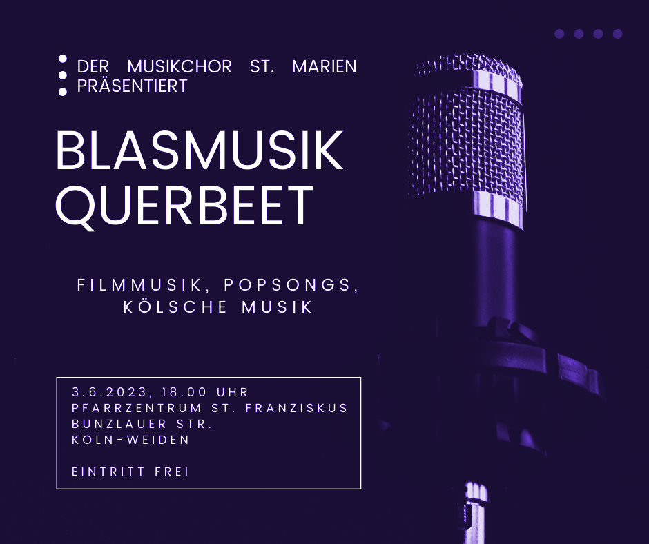 Am 3.6. um 18 Uhr spielen wir im Pfarrzentrum Bunzlauer Straße in Köln-Weiden einen bunten Mix aus modernen Popsongs, Filmmusiken und dem einen oder anderen kölschen Stück.