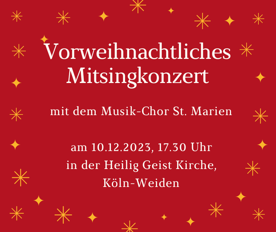 Am 10.12. geben wir in der Heilig Geist Kirche in Köln-Weiden im Rahmen des lebendigen Adventskalenders unser traditionelles vorweihnachtliches Mitsingkonzert.