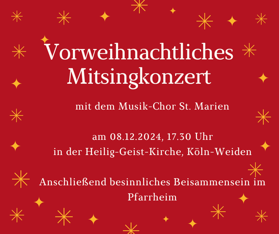 Große Ereignisse werfen Ihre Schatten voraus: am 8.12. geben wir in der Heilig Geist Kirche in Köln-Weiden im Rahmen des lebendigen Adventskalenders unser traditionelles vorweihnachtliches Mitsingkonzert.